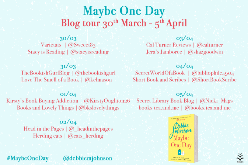 Hello and welcome to my stop on the blog tour for Maybe One Day by Debbie Johnson. Thanks so much to Alainna Hadjigeorgiou for the invite and to the publishers for my ARC via NetGalley. Before I share my review here’s what the book is all about: